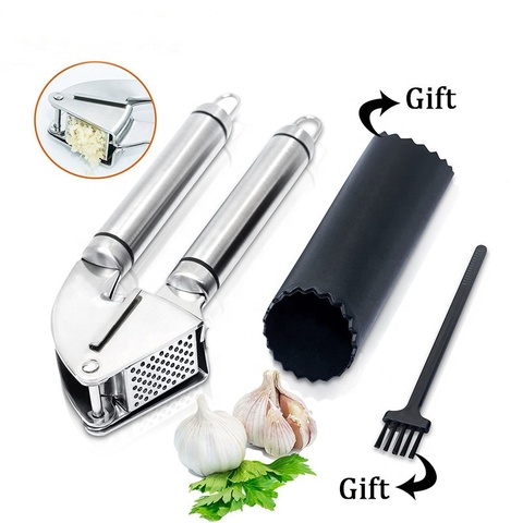 不锈钢压蒜器金属大蒜破碎机切碎机手压机,带大蒜硅胶滚筒削皮器和刷子